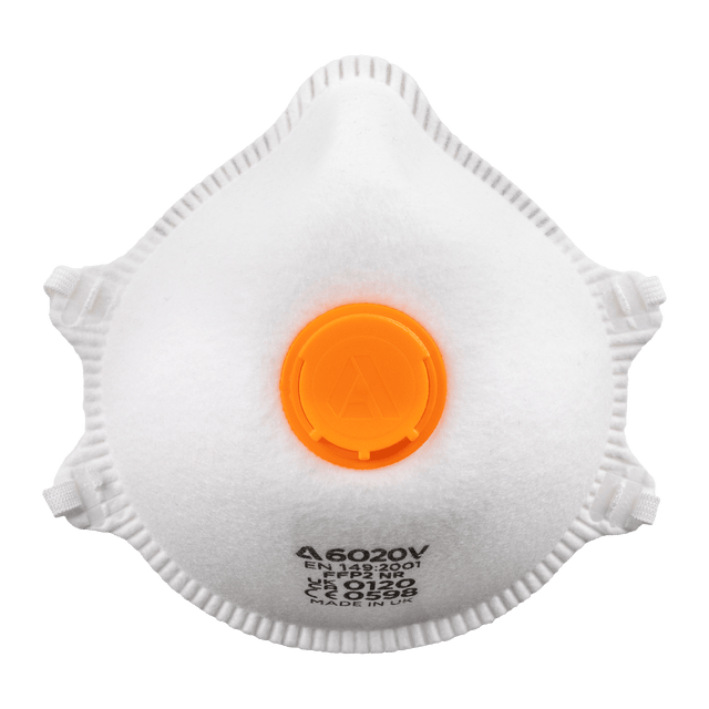 SKYTEC 6020V FFP2 NR valved cup respirator to EN 149:2001+A1:2009. Lightweight pre-formed design with preformed nosebridge, electrostatic filter media, PVC foam face seal and soft touch elastic. Box of 15.